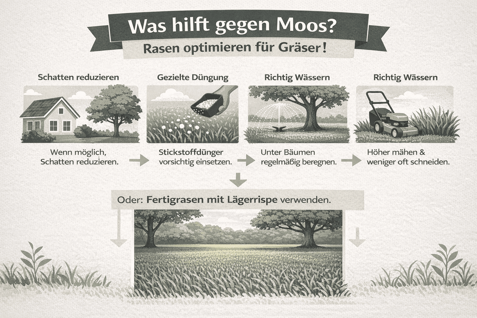 Die beste Strategie ist eine Kombination aus Standort verbessern, Gras stärken und Moos mechanisch entfernen, wenn nötig.